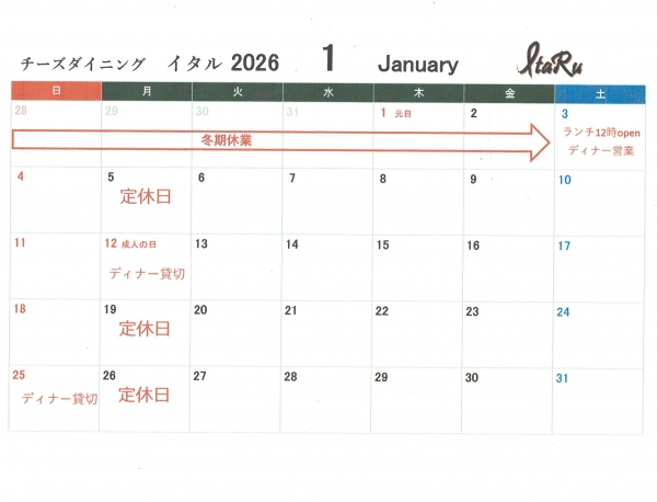 2026年1月の営業カレンダーです!